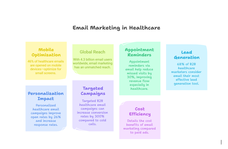 - Cost efficiency: Email marketing reduces cost per acquisition (CPA) by up to 40% compared to paid healthcare advertising.