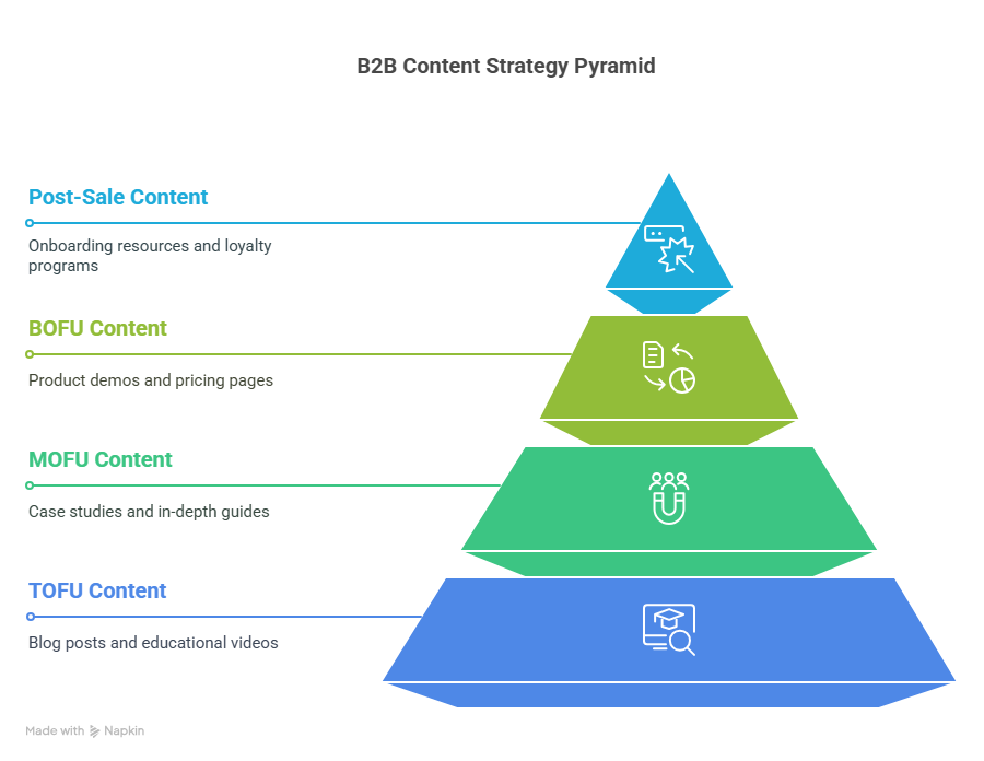 - Top of Funnel (TOFU): Blog posts, LinkedIn articles, educational videos.